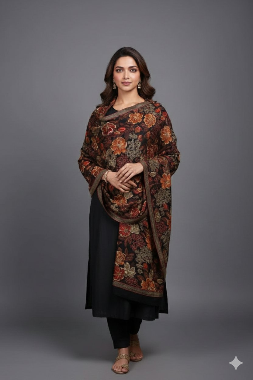 Elevate your winter style with this Elegant Karandi Embroidered Shawl, thoughtfully crafted to offer warmth, comfort, and timeless sophistication. The beautiful embroidery and rich black color make it a perfect accessory for both casual and formal wear.